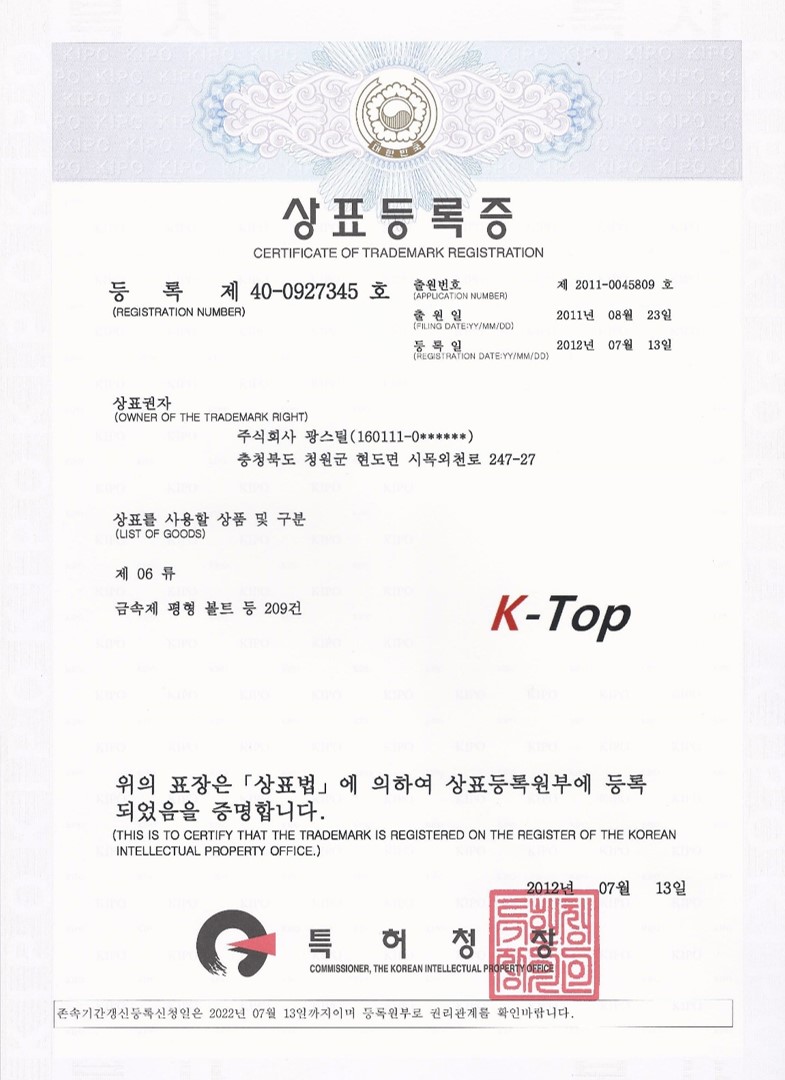 CERTIFICATE OF TRADEMARK REGISTRATION 제 40-0927345호